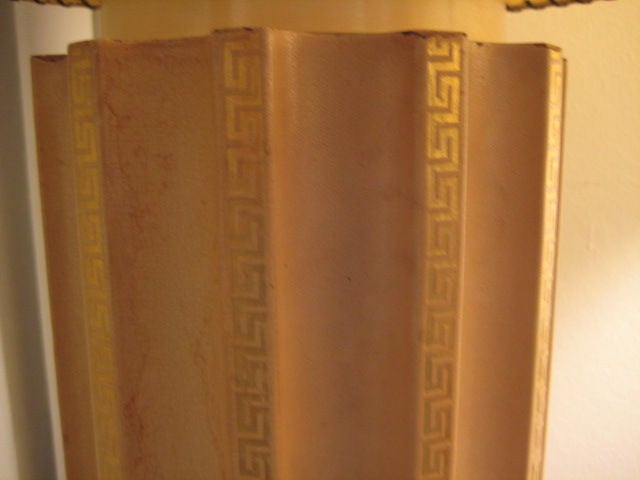 A pair of unusual, scalloped-column shaped lamps, covered in leather with greek key embossed design. Original mica shades included.