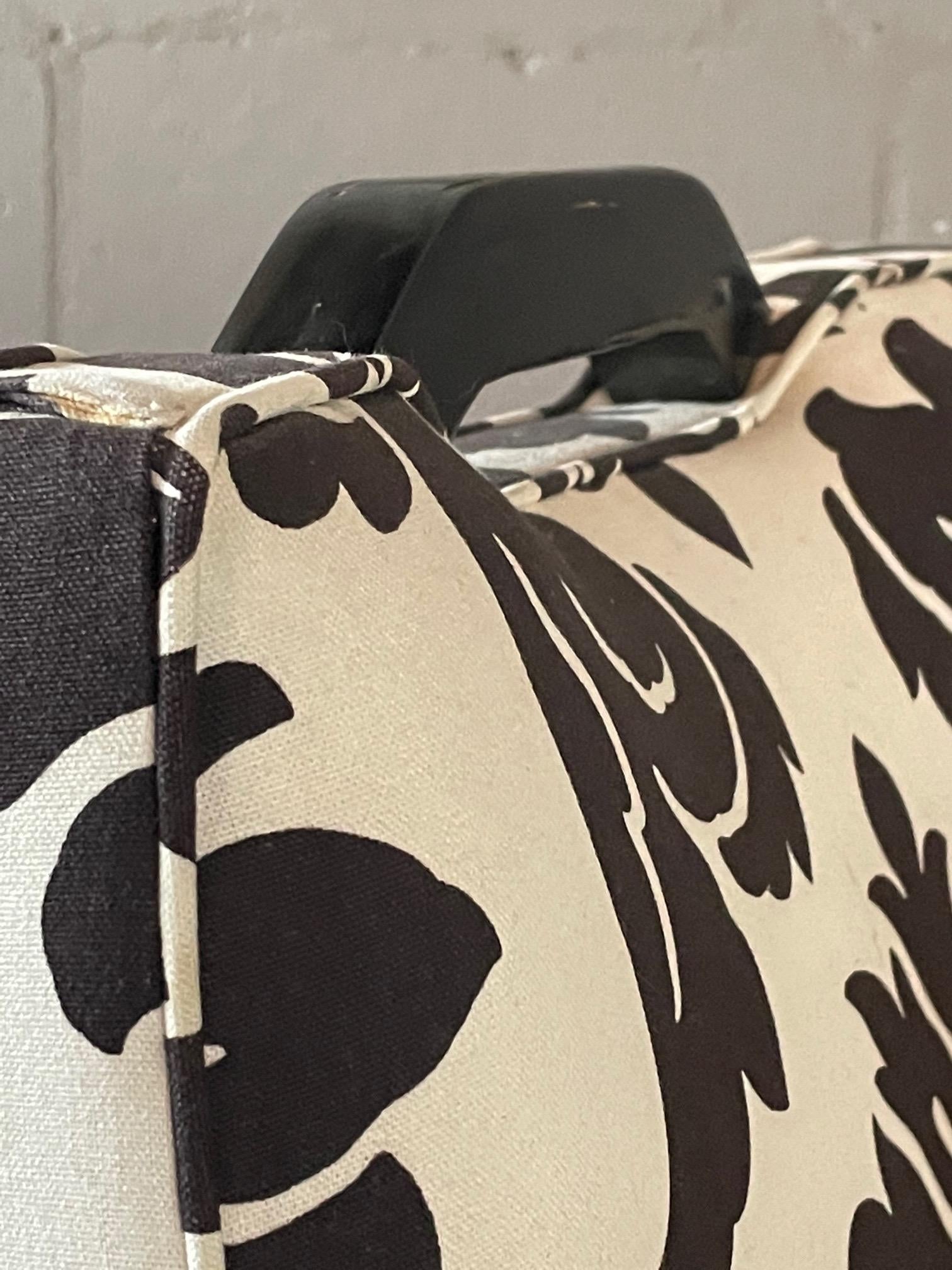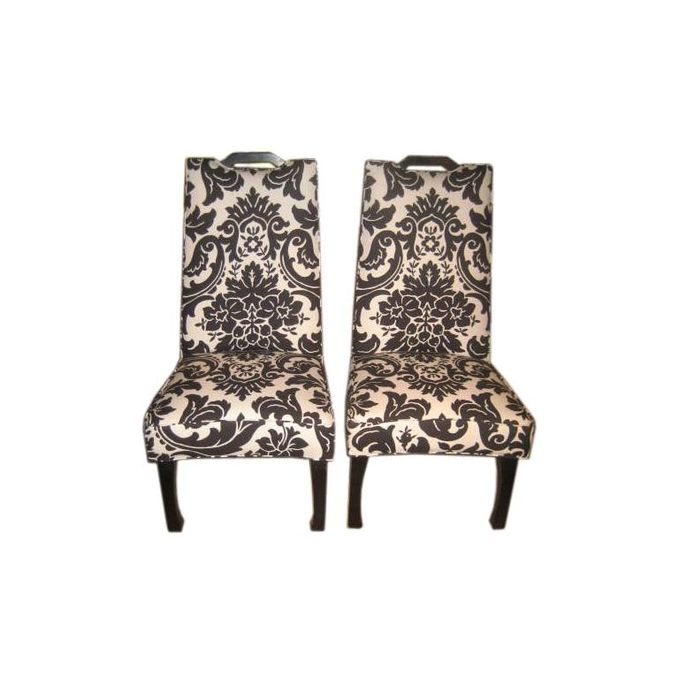 A pair of stylish, asian style, tall back chairs with black laquered handles. Upholstered in cotton, black/white abstract print.